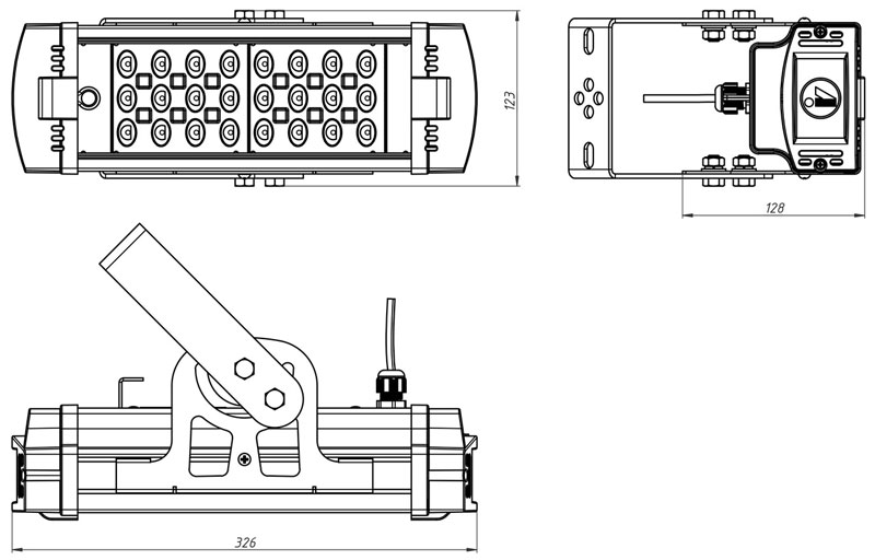 Прожектор светодиодный LL-INDUSTRY.2-030-124 крепится на любую твёрдую поверхность с помощью кронштейна (Лира), с изменяемым углом наклона 90 градусов.