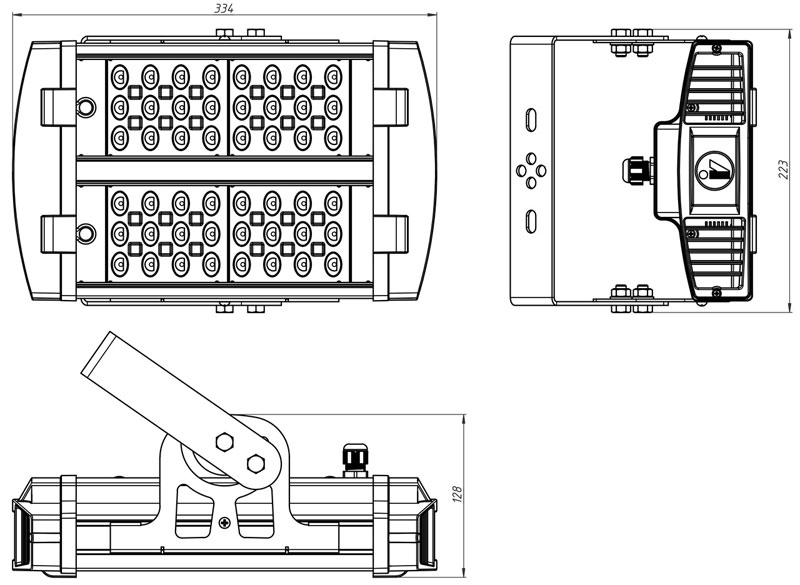 Диодный прожектор LL-INDUSTRY.2-060-224 устанавливается на любую твёрдую поверхность с помощью кронштейна (Лира), с изменяемым углом наклона 90 градусов.