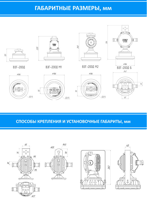 Светильник может поставляться с вводными коробками типа: "М2"- малогабаритная вводная коробка с резьбовым креплением крышки (700р.) и "Б" — большая вводная коробка (2780).