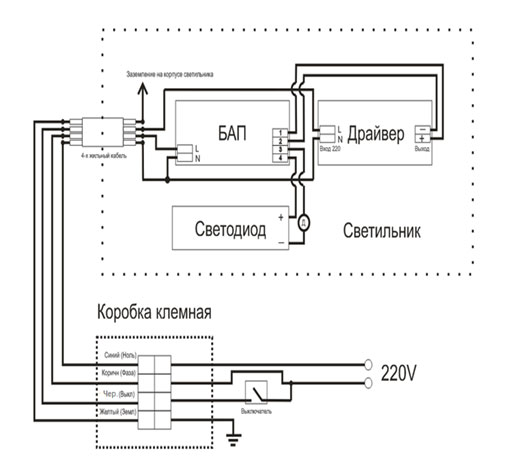 При отключении электропитания, включается аварийный режим освещения. Световой поток взрывозащищённого светильника в аварийном режиме уменьшается в 10 раз. Время работы в аварийном режиме до 3 часов.